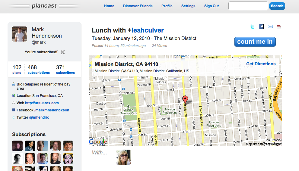 There are a few other smaller updates Plancast has rolled out with the big boys. They include password recovery, the ability to block other users (so they can’t subscribe or mention you), the collapsing of “ongoing” events on the main page, and the ability to put URL in plan titles. Hendrickson also notes that Plancast has started using a “No SQL” solution for some of their data. More tech-savvy readers may recognize that is also a solution FriendFeed is using on their backend, as Facebook’s Bret Taylor wrote about at length here. Plancast has open-sourced their version of this.