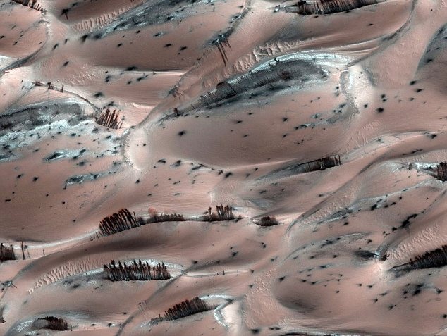 Look at the photo above. Doesn’t it look like rolling hills adorned with patches of trees? Well, it’s not. That’s a picture of Mars taken by the HiRISE, the most powerful camera sent to another planet, and the tree looking things are really just illusions. NASA says that they are just trails of debris left over from ice melt landslides and we can probably believe the agency.