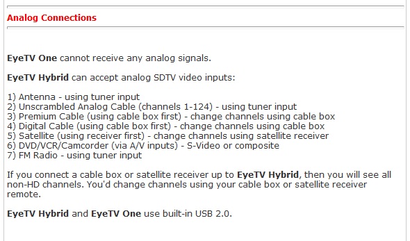 This Elgato support page clearly spells out the difference between the new $101.20 EyeTV One and the older, but feature-packed $128 EyeTV Hybrid. Look at just this one section out of eight and tell me why someone would buy the new model when the older one costs just $27 more and does so much more.
