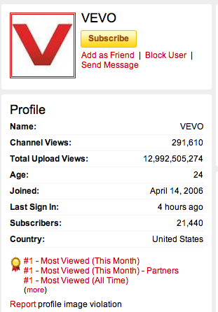 Not only does this illustrate the distribution might of YouTube, but it also shows how professional content is still hard to beat, even on YouTube. The Vevo channel is already the most viewed channel on YouTube, with nearly 13 billion views across all Vevo and all of Vevo’s sub-sites, which include the individual artist channels for Lady Gaga, Kings of Leon, Timbaland, and many others.