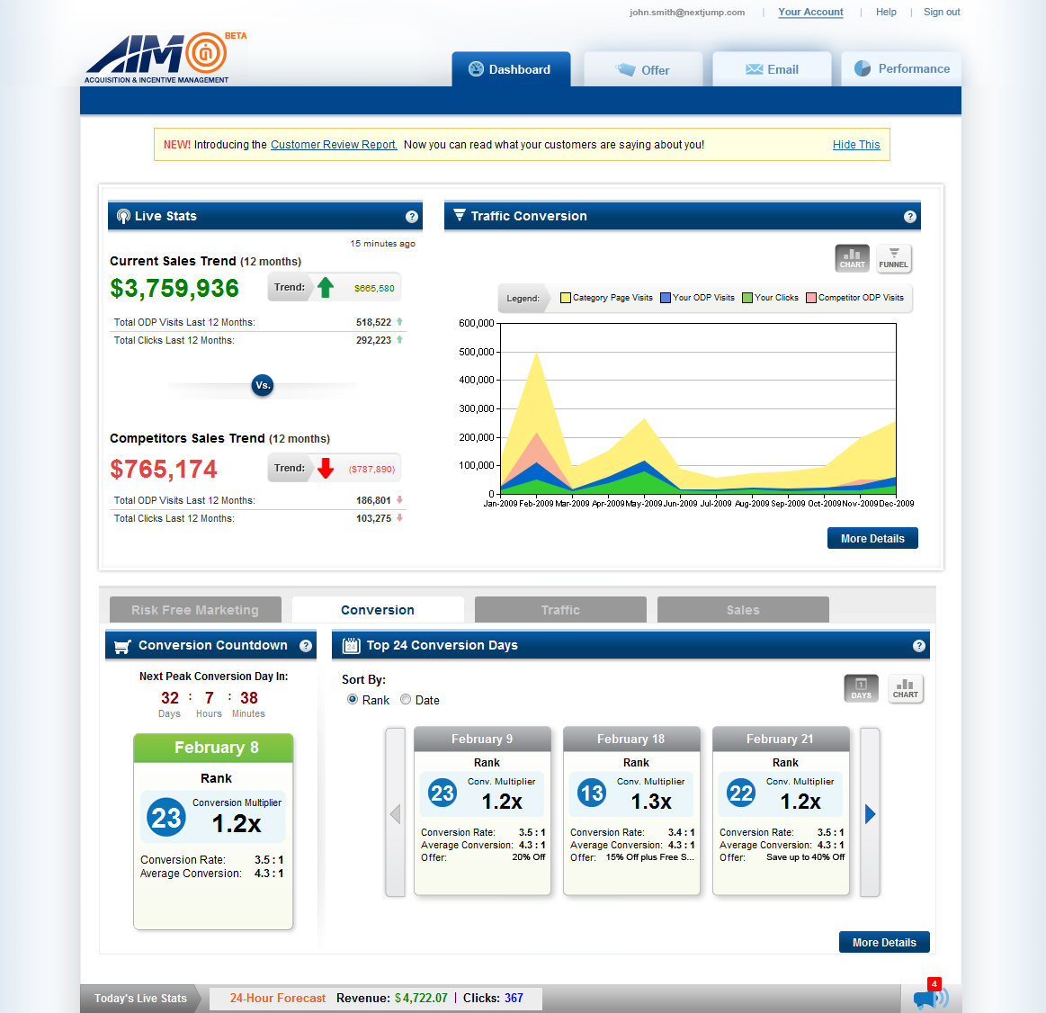Consumers tell Next Jump not only what items they would like to buy, but at what price point they would be willing to buy it for. Across various of its services, consumers can set reminders for when specific products are available for deeper discounts. For instance, you can say alert me when I can buy this pair of Nike running shoes for a 40 percent discount instead of the current 20 percent discount. Next Jump collects all of this data and presents it to participating merchants in an online dashboard (see screenshots below) which helps them model demand at different discount points. The dashboard also shows them current sales, average sales for competitors, conversion rates, and helps them target by different age, income, location, whether they are new or existing customers, and other factors.