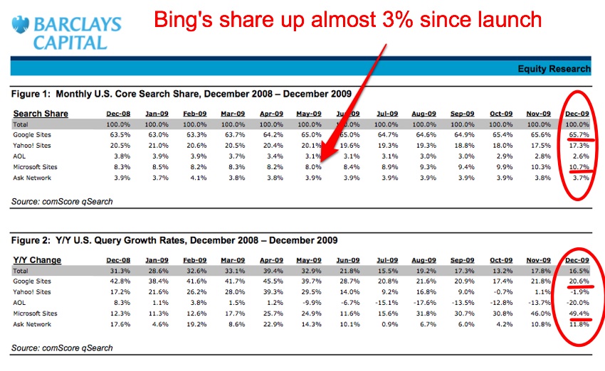 Bing just keeps on gaining market share, and is now growing faster than ever before. In December, Microsoft’s search engine gained another 0.4 percent to capture 10.7 percent of U.S. search queries, according to the latest comScore qSearch numbers. That makes five straight months of steady share gains for Bing since it launched—Bing’s share is up 2.7 percent in total since May, 2009. Google gained only 0.2 percent to end the month with 65.7 percent market share. Meanwhile, Yahoo lost as much as Google gained (0.2 percent) to end the year at 17.3 percent (see table above, courtesy of Barclays Capital, click to enlarge).