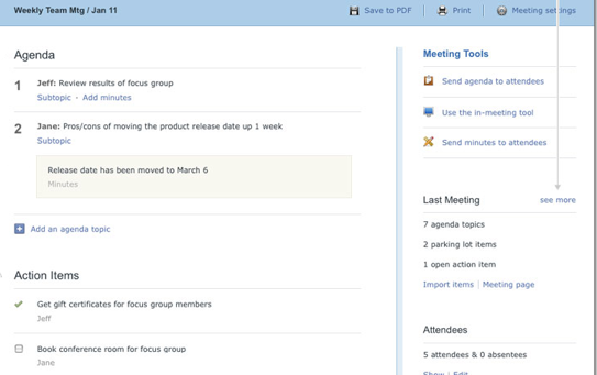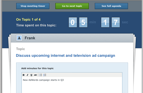 MeetingMix also has a set of features you can use during and after the meeting. During the meeting, you can use a tool that helps you transcribe notes about each item on the agenda, which are later compiled into the meeting’s minutes and can be sent to all the attendees. You can project an agenda page in front of everyone, so your co-workers know exactly what topic you’re currently supposed to be talking about. This mode also includes a timer at the top of the screen that helps you keep track of how long you’ve spent on a given topic so that you don’t run over time.