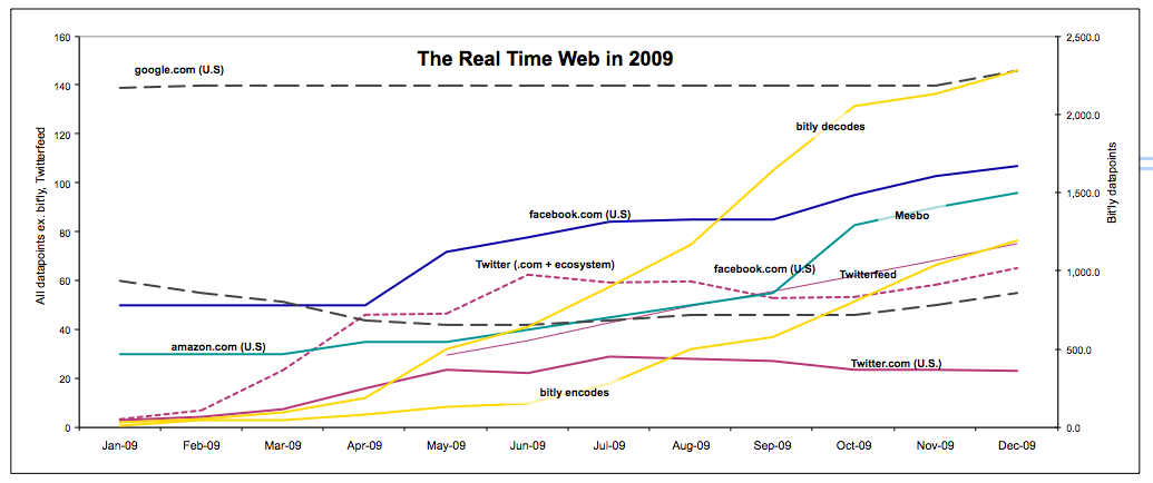 Finally, he pulls together a lot of different data points into a single chart to show the relative growth of the Realtime Web compared to the established Web as represented by Google and Amazon (the dotted lines in the chart below). In addition to the Twitter ecosystem (red dotted line), he also plotted Facebook (blue) and Meebo (green), both of which are growing even faster. Then he overlaid the bit.ly data on top of it all, which is based on a different scale. It’s a messy chart, but the one takeaway is that the Realtime Web is represented by the various colored lines and is growing at a healthy clip.