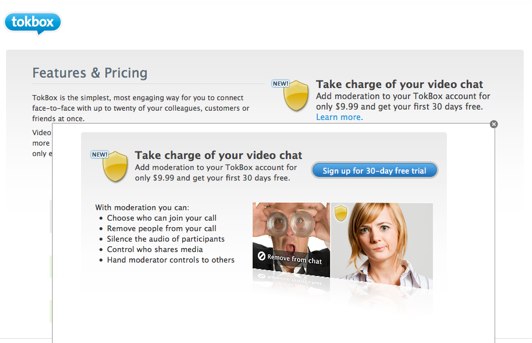 TokBox is obviously looking to create a revenue stream with the paid features, allowing users to pay $9.99 per month to add moderation functionality for chats. So with the paid features, you can choose who can join your call, remove people from your call, silence the audio of participants, control who shares media on the chat, and distribute moderator controls to other members of a chat. It also appears that the startup will charge users if they want to add more than 20 people to an individual chat.