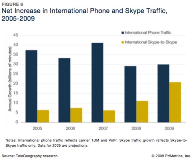Skype’s traffic, however, has soared. The service’s on-net international traffic (between Skype users) grew 51 percent in 2008, and is projected to grow 63 percent in 2009, to 54 billion minutes.