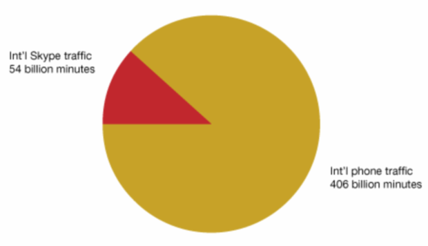 VoIP services juggernaut Skype has seen its share of international calling minutes jump to 12% in 2009, a 50% increase compared to the year before. And as you can tell from the pie chart below, 54 billion minutes out of 406 billion in total were accumulated by users calling each other Skype-to-Skype last year. Are you listening, carriers?