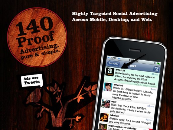 Now, startup 140 Proof is entering the mix with its Twitter-based ad network. The network bypasses Twitter’s site completely and allows 3rd-party Twitter clients sell space on the network to advertisers. The ads appear in third-party Twitter clients who use 140 Proof’s API to serve and measure their ads. Ads are served within users Twitter streams on these clients (mobile, desktop or web) and clearly marked as ads.