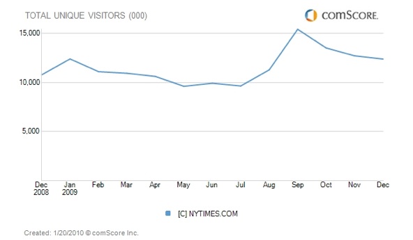 Details are spare on how exactly the model will work, but it is possible to do some rough back-of-the-envelope calculations. According to comScore, NYTimes.com attracted 12.4 million U.S. visitors in December, 2009, down from 15.4 million in September, 2009. If you include all the sites the New York Times operates, including About.com, Boston.com, and the sites of various local papers, the numbers jump to 52.8 million U.S. visitors in December. But right now the company is only talking about putting up a metered billing system on the NYTimes.com proper. So we are talking about an audience of 12.4 million in the U.S. and about 20 million worldwide.