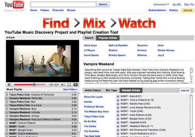 There are so many music search engines out there based on YouTube music videos (Songza comes to mind) that it was only a matter of time until YouTube created its own music playlist maker. The YouTube Music Discovery Project just launched quietly out of TestTube (YouTube’s labs). The page is a search box on top of which says, “Find>Mix>Watch,” and once you enter a name, you hit the “Disco” button to find music.