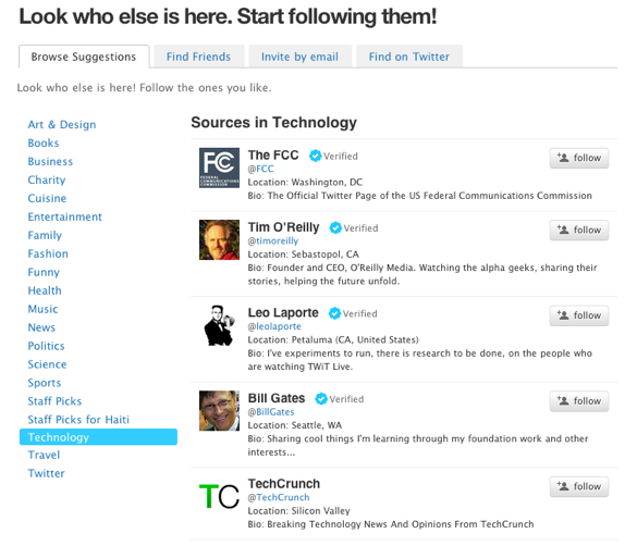 We’re still playing around with the new suggestion feature, but here’s what we’ve gathered so far. First, it looks like members of the old SUL have been transitioned over to the new format. There are twenty categories, covering everything from Technology to Cuisine (there’s also sections for Staff Picks, as well as a spell list of Staff Picks for Haiti). Clicking on one of these categories will bring up 20 recommended Twitter users. It appears that the order of the users presented has some randomness to it — I’ve had the order of the Technology section switch a few times as I played around with it.