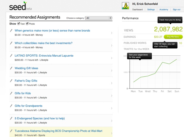 That may be where Hansell wants to take Seed, which is still in beta and being kluged together on the back-end, but it’s definitely not where it is today. Seed, at least right now, looks more like Aol’s answer to Demand Media or Helium, where the going rate for an SEO-friendly how-to article seems to be in the $25 to $50 range.