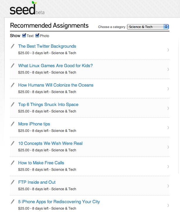 What are some of the current assignments on Seed ready to redefine journalism? I signed up for Seed to take a look around. The first thing I saw is that Aol seems to want someone to write a lot of gift guides (for weddings, Father’s Day, Valentine’s Day, kids, grandparents, teachers, and groomsmen). Then I went to the science and tech assignments. Seed is offering $25 for articles on the “Best Twitter Backgrounds,” “How Humans Will Colonize The Oceans” ($25), “10 Concepts We Think Were Real,” and “How To Make Free Calls.” (See screenshots below).