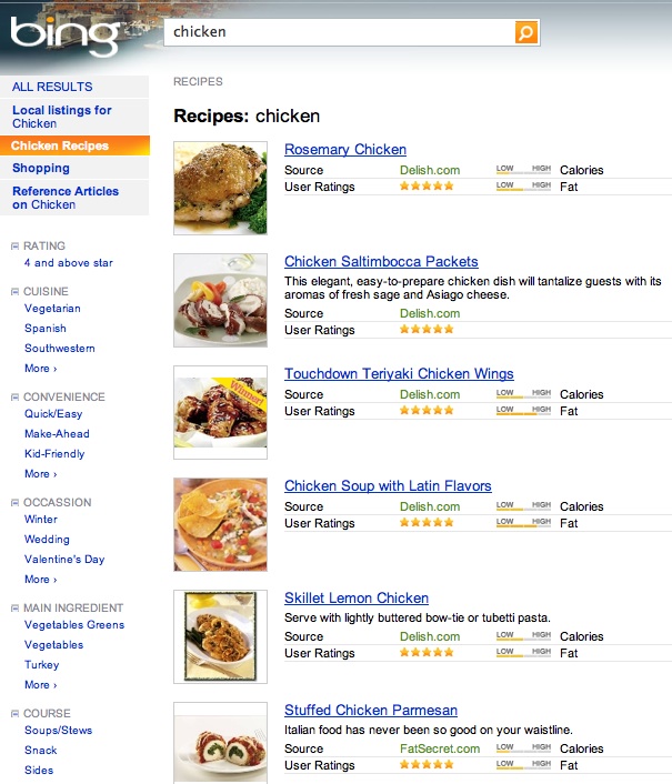 Yesterday, Bing released a surprisingly useful new feature around recipe search. If you search for “Chicken,” you can narrow the results down by “chicken recipes” and then a whole bunch of new filtering options appear down the left-hand column. You can further narrow results by recipe rating, cuisine (vegetarian, Spanish, Southwestern), convenience (quick/easy, family, entertaining), occasion (wedding, Valentine’s Day), main ingredient, course, or cooking method. Bing is big on guided search (showing relevant search categories to help narrow results), but this goes one step further towards semantic search (the ability to index and search the Web by different facets). Recipes are just the beginning, and it’s not just Bing. Google and a handful of startups, including Evri, Hakia, and Radar Networks, are hard at work on making semantic search a reality. The race is on to bring this type of semantic filtering for nearly every category of search across the Web.