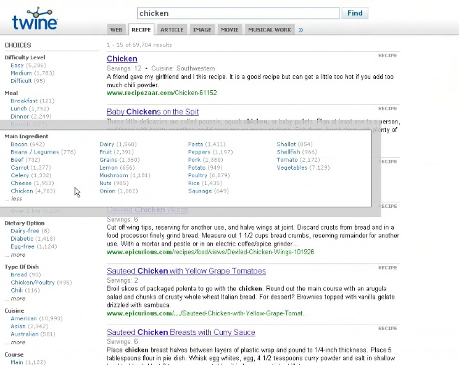 In fact, Bing’s recipe search looks a hell of a lot like T2, the semantic search engine being developed in private by Radar Networks. The startup currently offers a semantic bookmarking application called Twine which is on autopilot, but T2 is much more ambitious. Not many people have seen T2, but CEO Nova Spivack once gave me a demo and I took a bunch of screenshots like the one above (there are also slides on the Web). When you search for “chicken” on T2, you can also narrow by difficulty level, meal, main ingredient, dietary option, cuisine, course, and so on. Recipes happens to be one of T2’s strong suits. It has perhaps the largest semantic indexes of recipes in the world with 300,000 recipes. But it is also building out its semantic search index for video games, movies, music, travel, health, sports, and other category verticals.