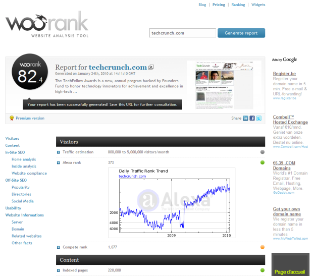 I gave the tool a spin and generated a report for beta.techcrunch.com – turns out we’re worthy of a WooRank of 82.4. While I have absolutely no idea what that means exactly, according to these statistics we’re well above the average. In the overall ranking, we even made the top 50, ahead of sites like the Apple Store, MySpace, ESPN.com and NYTimes.com (take that, New York Times, we haz bigger WooRankz!).