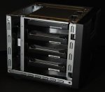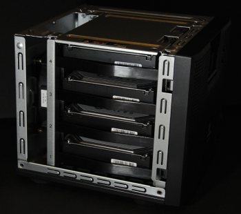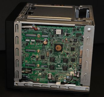 The NAS in itself isn’t terribly impressive looking, but it doesn’t have to be. There’s a power button, three status lights, a USB port, and an LCD display on the front. The LCD display shows you that status of the device, including if there are any jobs working, and how much space you have remaining. The back has two gigabit ethernet ports, and the power plug in point. Oddly, the cover to the case sits sideways, meaning that the drives are mounted sitting sideways as well, instead of facing out of the front of the case. Iomega puts four drives in the NAS for you, and you can select from the various RAID configurations to choose the one that works best for you. Drives are hot-swappable of course, based on the level of RAID selected.