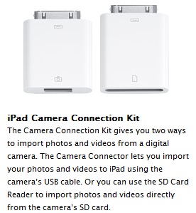 Just think about photographers. The SD card slot would allow them to quickly and efficiently preview their shots on a large screen. The USB port would even allow them to control some DSLRs directly from the iPad with the right app. But nope, can’t do it without an adapter. Even then, they would only be able to use one at a time because of the single dock connector.