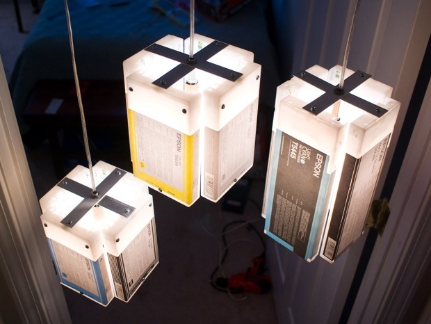 Etsy seller boxlightbox’s hanging Epson cartridge lamps are 6″x6″x8″ and sell for $45 plus shipping. That ain’t bad, though you’ll need a few of these 40-watt wonders to make your work environment any species of bright. They come in various colors, obviously.