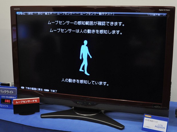 There’s also a “move sensor” (see picture above) that can be programmed so the TV turns itself off automatically when you leave the room and turns itself on again when you re-enter (range: 3m). The idea is to help save energy, and Sharp says they managed to cut general power consumption in these models by 30%.