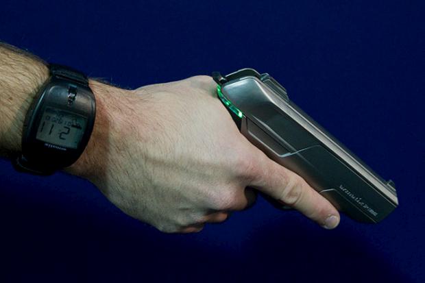 This seems like a really good idea. A German company called Armatix has developed a handgun that can only be fired by someone wearing a biometrically unlocked wrist watch. An LED light on the gun glows green if it’s set to be fired or red if it’s locked.