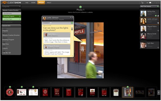 To engage in a virtual “pitch,”clients are given a link that lets them view the session in their browser. While the users who are pitching the idea are using an Adobe Air application, the client will see the actual pitch within their browser. Here’s where ClientShow brings in the collaboration angle: as you are pitching an idea, decision makers on a client team can approve (or dismiss) different ideas and files and give feedback automatically by adding notes and comments to the pitch that are updated in realtime.