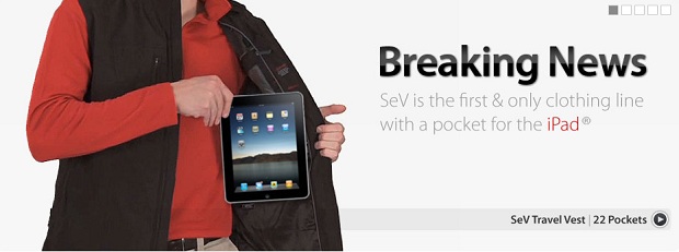 IPad accessories are popping up everywhere. Proof? ScotteVest is now advertising its 22-pocket Travel Vest for Men as the first clothing line with a pocket for the iPad. Maybe that explains where Colbert was holding his during the Grammys. He seemed to pull it out of nowhere. That’s what ScotteVests are known for after all — gadget concealment.