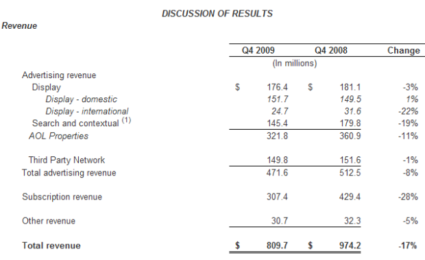 What caught our eye is that revenues are down 17% YOY, dropping from $974 million in Q4 2008 to roughly $810 million in the fourth quarter of last year. Zooming in on advertising revenue, Q4 revenues on that level dropped 8%, from $512.5 million in the fourth quarter of 2008 to $471.6 million in Q4 2009.