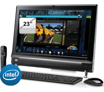Other upgrade options include various flavors of Windows 7, hard drives starting at 750GB, DVD burner or Blu-ray combo drive, TV tuner, and more. Standard features include a 23-inch touchscreen at 1920×1080 resolution, wireless keyboard and mouse, card reader, webcam, five USB ports, game console input (HDMI, composite), and a 1GB NVIDIA GeForce GT230M graphics card.