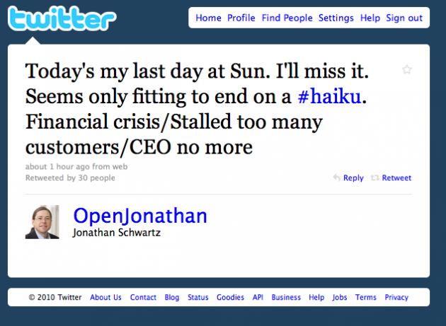 Today’s my last day at Sun. I’ll miss it. Seems only fitting to end on a #haiku. Financial crisis/Stalled too many customers/CEO no more