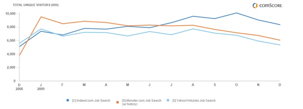 Both Hotjobs and Monster have been lagging newer job search sites such as Indeed, which searches the entire Web for job listings. According to comScore, Indeed’s jog search reached 8.4 million individuals in the U.S. in December, 2009, compared to only 5.4 million for HotJobs and 6.1 million for Monster. Maybe with the acquisition, Monster can take the top spot again, although there is a lot of overlap in those numbers.