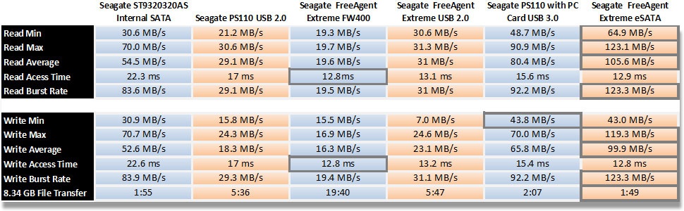 Testing parameters: These numbers were gathered using HD Tune Pro 4.01. I also timed an 8.34 GB file transfer onto the drive for real world results. The two external drives were 7200 RPM models, while the internal was a 5400 RPM drive. I would have liked to show the Western Digital MyBook 3.0’s results as well, but the drive and HD Tune Pro didn’t get along. Check out the review for a comparison between the Seagate PS110 — it’s just slightly faster.