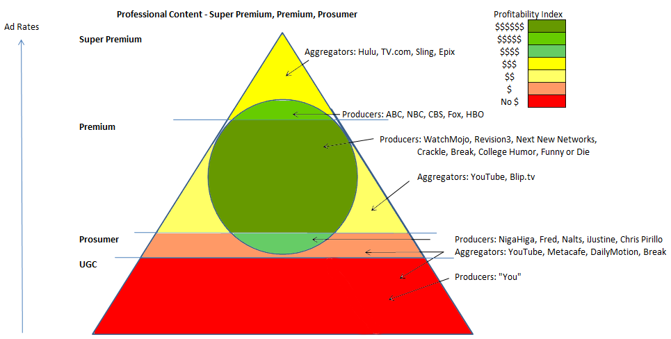 The reason why I place content producers in the highest Profitability circle over time in the first chart above is because only they can build such a business. (The Profitability Index represented in the chart takes into account operating margins and total return on investment, including likelihood of a liquidity event). And, yes, I am completely biased, since this is the kind of business I am trying to build with WatchMojo. Aggregators and networks are solely advertising based businesses; just ask YouTube who generated $10,000 in a paid model test, even though it can generate billions in simpler ways. Video advertising will be a bigger business, but not necessarily a higher-margin business.
