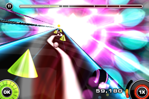Riddim Ribbon is a fusion between racing, popular songs, and to some extent, remixing music. After choosing a song, the game throws you into a hyper-colorful racetrack, where you pilot a futuristic spherical vehicle. The track is filled with small orbs (which are good) and obstacles (which are not), and there’s a path showing you where you should be driving. To control your vehicle, you tilt your iPhone from side to side. Most of this is standard fare for racing games, but Riddim Ribbon comes with a twist: you actually can modify the music you’re listening to during the race depending on how you navigate the course.