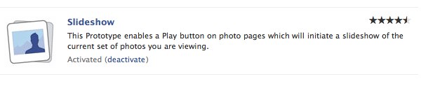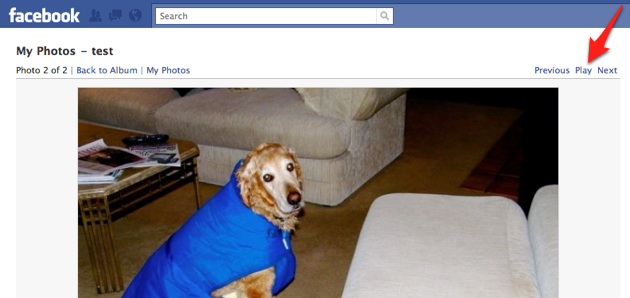 The new feature was released as a Facebook Prototype some time last week, and it’s about as basic as they come. After activating it, you’ll find a ‘Play’ button nestled between the ‘Previous’ and ‘Next’ navigation buttons in the photo viewer. Clicking it will turn the album you’re currently viewing into a slideshow, displaying a new photo every five seconds. That’s it. There apparently isn’t any way to change the frequency of the photo changes, and there aren’t any fancy transitions like you’ll get from iPhoto. But hey, you don’t have to click any more.