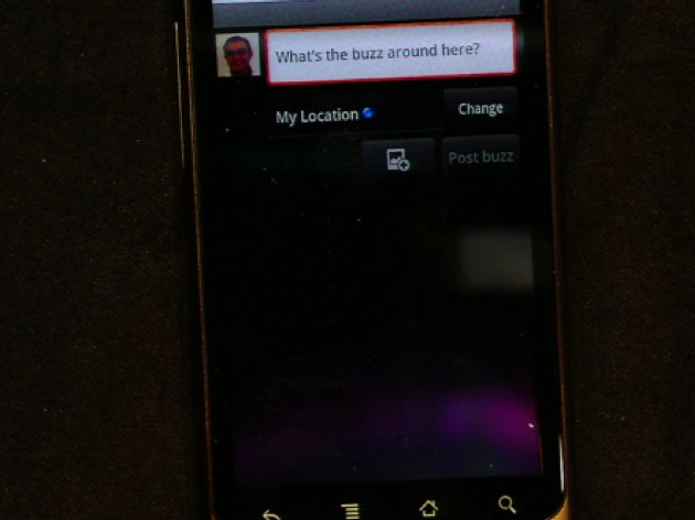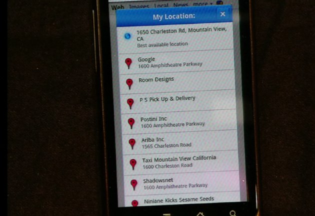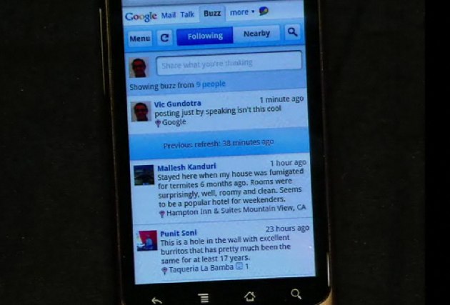 When you click on Buzz on the Google homepage, we find your location with your phone’s GPS – we take the lat/long and recommend a place we think you’re at. So how does this work indoors? The same technique but we use time or day, and things nearby you to guess where you are. It’s very smart. You can also use voice input to post to Buzz.
