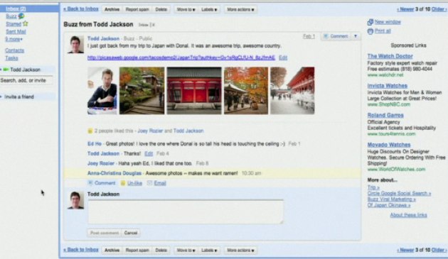 Buzz tab is right below the Inbox tab in Gmail. As you can see, there are a lot of people I’m already following. In Buzz you see links, you see photos and videos.