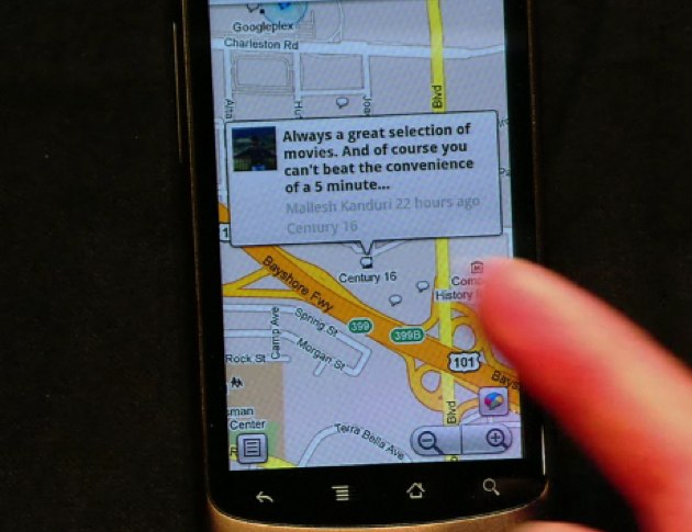 There’s a brand new Buzz layer. This is nicely integrated to pull your location. We geotag buzzes. You can also post pictures right from Google Mobile Maps – again, geotagged. You can see white chat bubbles that show Buzz elements on the map.