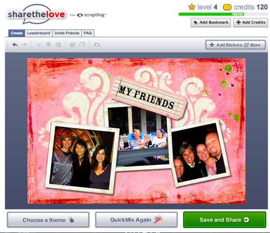 When you first start using Share the Love, the app will employ Scrapblog’s recently launched QuickMix technology to instantly generate a photo collage with up to ten Facebook photos. The photos will be automatically arranged with a set theme, which you can change easily (Valentines themes appear to be set at the moment). Similar to Scrapblog’s online site, the app offers users coordinated stickers, backgrounds and captions. And users can easily change photos from the photos they are tagged in and from their personal albums. You can also bypass Scrapblog’s technology and start from scratch by picking a theme and choosing the photos to feature. Once you are finished designing your collage, you can publish the scrapbook to your Facebook page and photo albums.