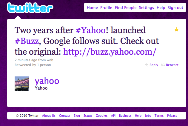 But Yahoo wasn’t done take shots at Google Buzz with its PR blitz. The official Yahoo account on Twitter also chimed in noting that Yahoo Buzz, a product with the same name but completely unrelated, launched two years ago. Yahoo has an event tomorrow to talk about something. This could get ugly.