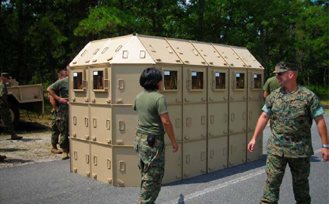 The McCurdy’s Armor (named after a soldier who died in 2006) comes complete with gun ports, steel plated armor, and different levels of construction for different tasks. The Marine Corps has already bought 14 of the reusable units, however there’s no word if they are actually in use in any conflict areas. Seems like a great concept to me.