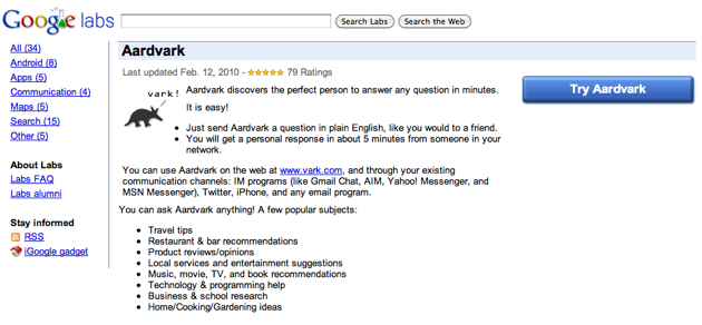 Unlike some of Google’s past startup acquisitions that resulted in services shutting down or restricting new user signups, Aardvark is going to continue running at full steam. New users can still sign up, and it’s already featured as part of Google Labs (though it hasn’t been integrated with Google search at all — it’s just a link to Vark.com).