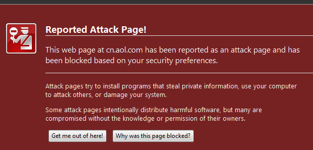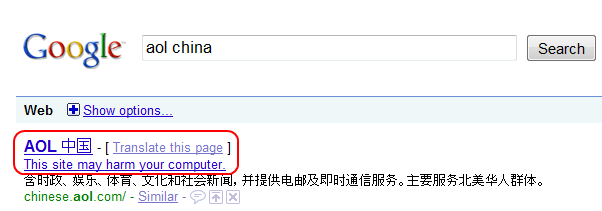 Google Chrome and Firefox both throw up a malware warning for AOL’s Chinese portal (click at your own risk), and Google even warns people who run a search for ‘AOL China’ that the site may harm their computer, as you can tell from the screenshot above.