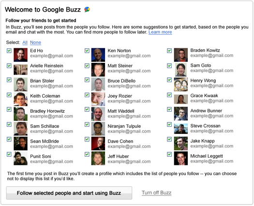 New users will see a screen like the one above, and Google’s post says that existing Buzz users will be shown a version of this friend selection screen in the next few weeks to confirm that they’re comfortable with everyone they’re following. The service is also going to stop automatically connecting Google Reader and Picasa albums to Buzz accounts, though those options will still be available.