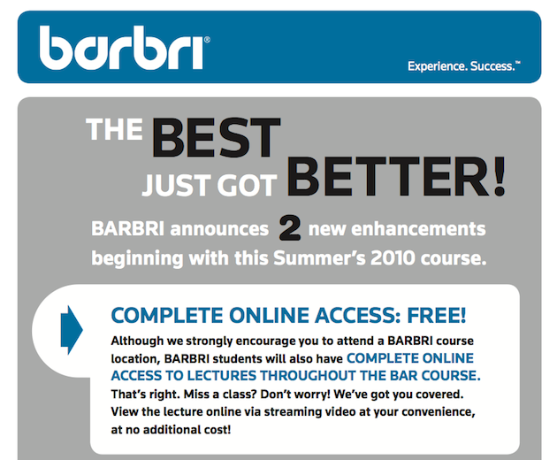But by leveraging the wide reach of the App Store, it seems that BarMax has found a way around some of this anti-competitive behavior. And BarBri is clearly threatened. The company has begun circulating fliers on law school campuses proclaiming two new “enhancements” for the Summer 2010 classes. The first will grant BarBri participants unlimited online access to course materials with their standard fee. It’s pretty funny this wasn’t included in the several thousand dollar price tag before since it likely costs BarBri next to nothing to grant this access.