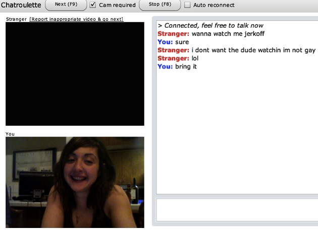 I pressed “play” last night at around 3:00 am PST and after about 45 clicks on “Next” encountered 5 straight up penis shots, a lot of “camera disabled” chats, two women who automatically clicked “Next” once they figured out that I too was a female, and a lot of very grateful looking guys, including a Chinese “fan of Google” and a French guy in indoor sunglasses, who asked me whether “I was a more dominate lady or submissive woman” in the hope that I would be the former.