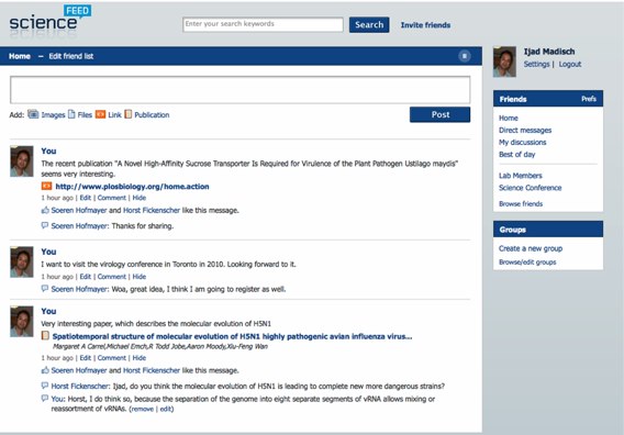 Sciencefeed allows users to post short microblogs (not restricted to 140 characters) on scientific headlines, new findings, controversy, conferences and ideas related to science. You can follow users; respond to other member’s entries, and comment on various topics in realtime. You can search for topics and keywords fairly easily and publish updates to Twitter and Facebook. Since conferences are an integral part of scientific research, Scienfeed allows users to create groups around events and even aggregate updates from participants based on a hashtag, similar to Twitter. Publications can be attached to a feed, allowing users to automatically search through 10 different literature databases (such as PubMed) and RSS feeds.
