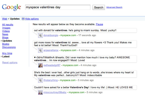 Google just added another content boost to its stream of real-time information: it now features MySpace updates, which will start appearing both on Google’s main search results page and under the ‘Updates’ filter in the advanced search bar. The move was actually announced back at Google’s search event in December, which featured the debut of Google’s real-time search results, and is going live today. MySpace says that it sees around 1 billion status updates a month, which is about on par with what Twitter currently gets according to a recent Pingdom report.