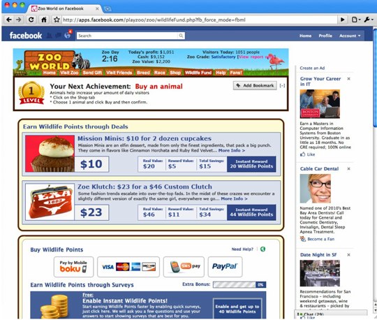 So when playing a game on Facebook, a user will see the option of earning points for the game is they buy a Groupon-like deal. Cherry Deals uses your IP address to figure out where you are, and then serves up both national and local deals. Once you click on a deal, you can pay with your credit card within Facebook and you will receive the virtual currency in your gaming account. Cherry Deals will also serve as a standalone Facebook app. For now all the deals are U.S. based but Cherry Deals plans to expand to the U.K. and Canada by the end of this year.
