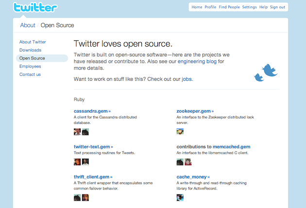 The list is fairly impressive. It includes open source projects in Ruby, Scala, Java, C/C++, and other various tools. Some of them you may have heard of, such as Cassandra, the P2P structured storage network Facebook began in 2008. While some of them you may have not, such as Murder, the code deployment project that uses Bittorrent. Underneath the short description of each project, you’ll see the icon for the Twitter employee that is working on it.